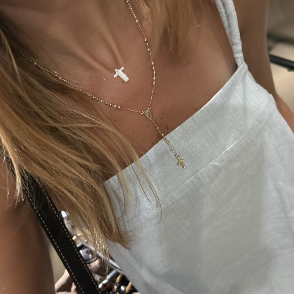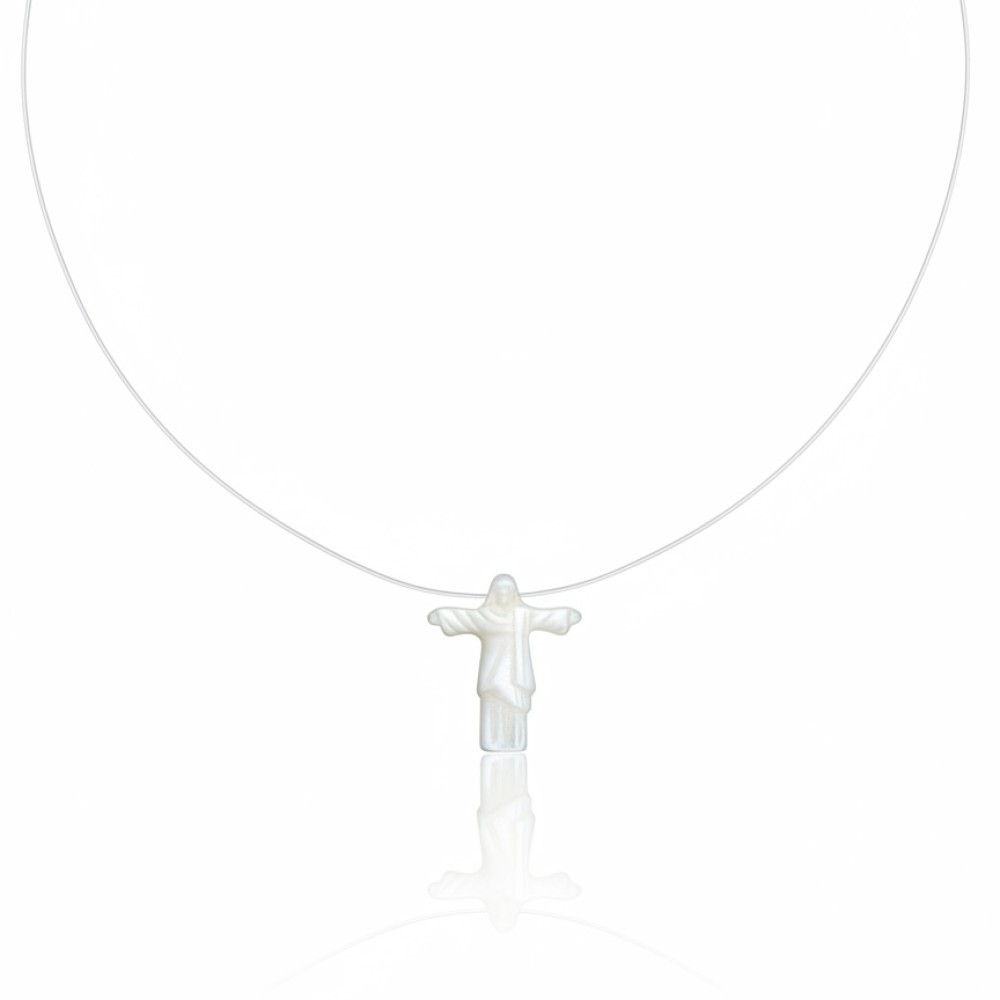 Colar Cristo Madrepérola Fio de Nylon Banho de Ouro 18k.