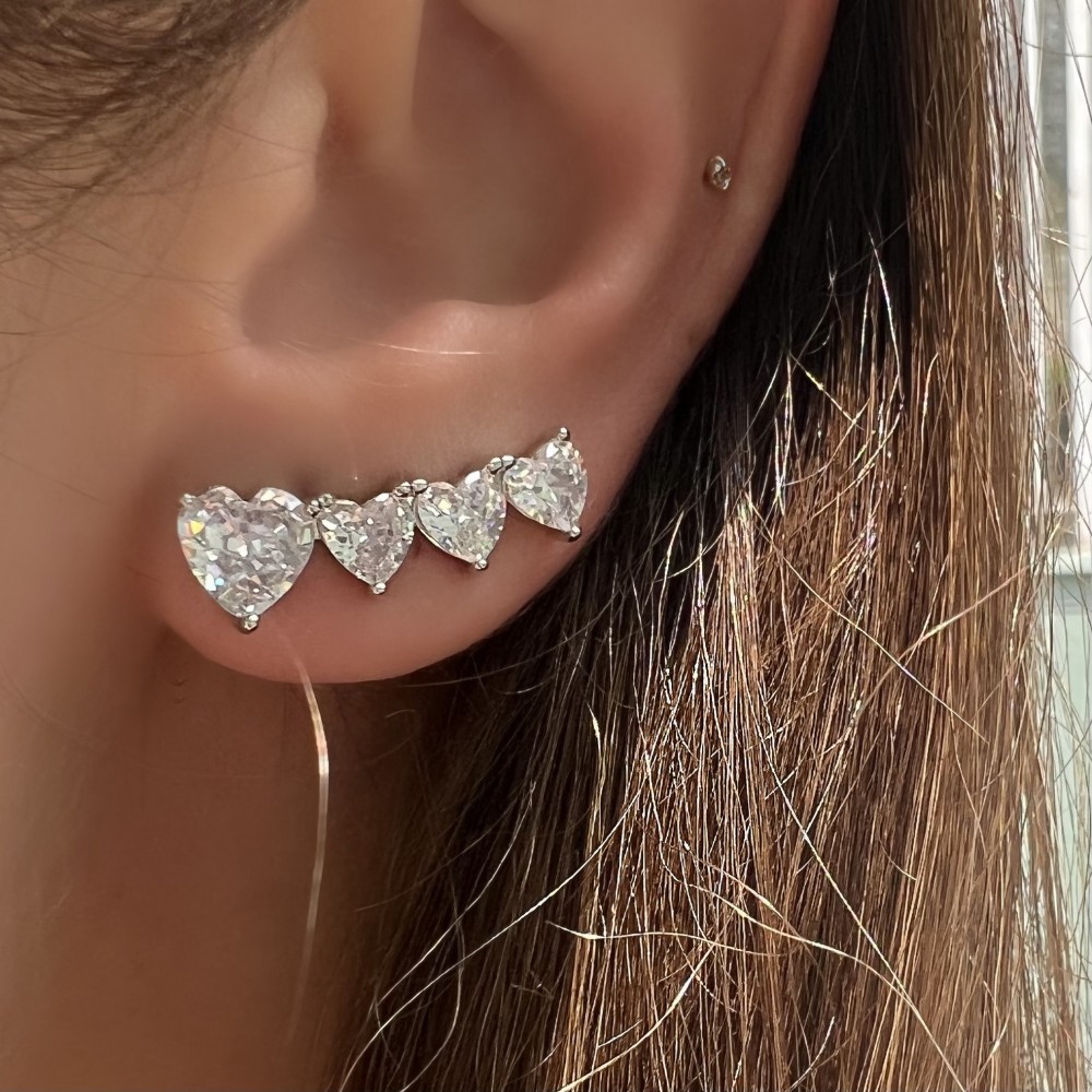 Brinco Ear Cuff Corações Cristal Ródio Branco.