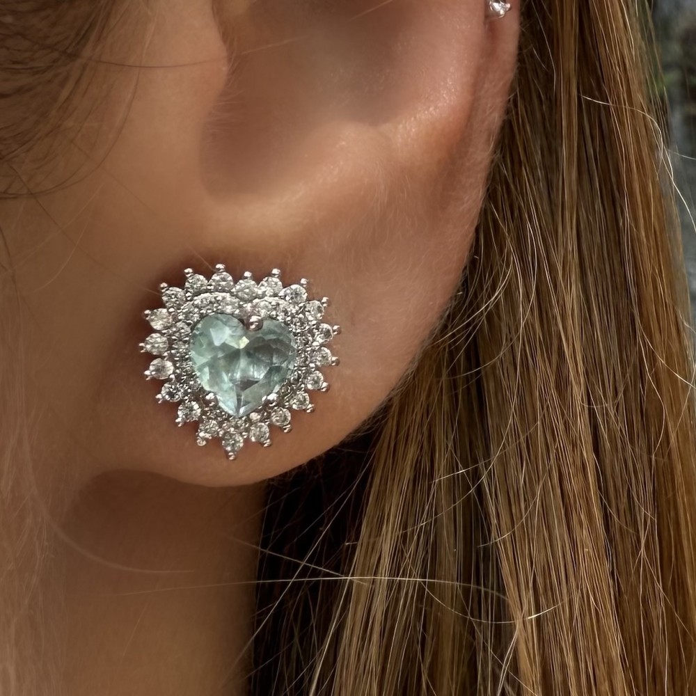 Brinco Coracao Agua Marinha Banho de Rodio